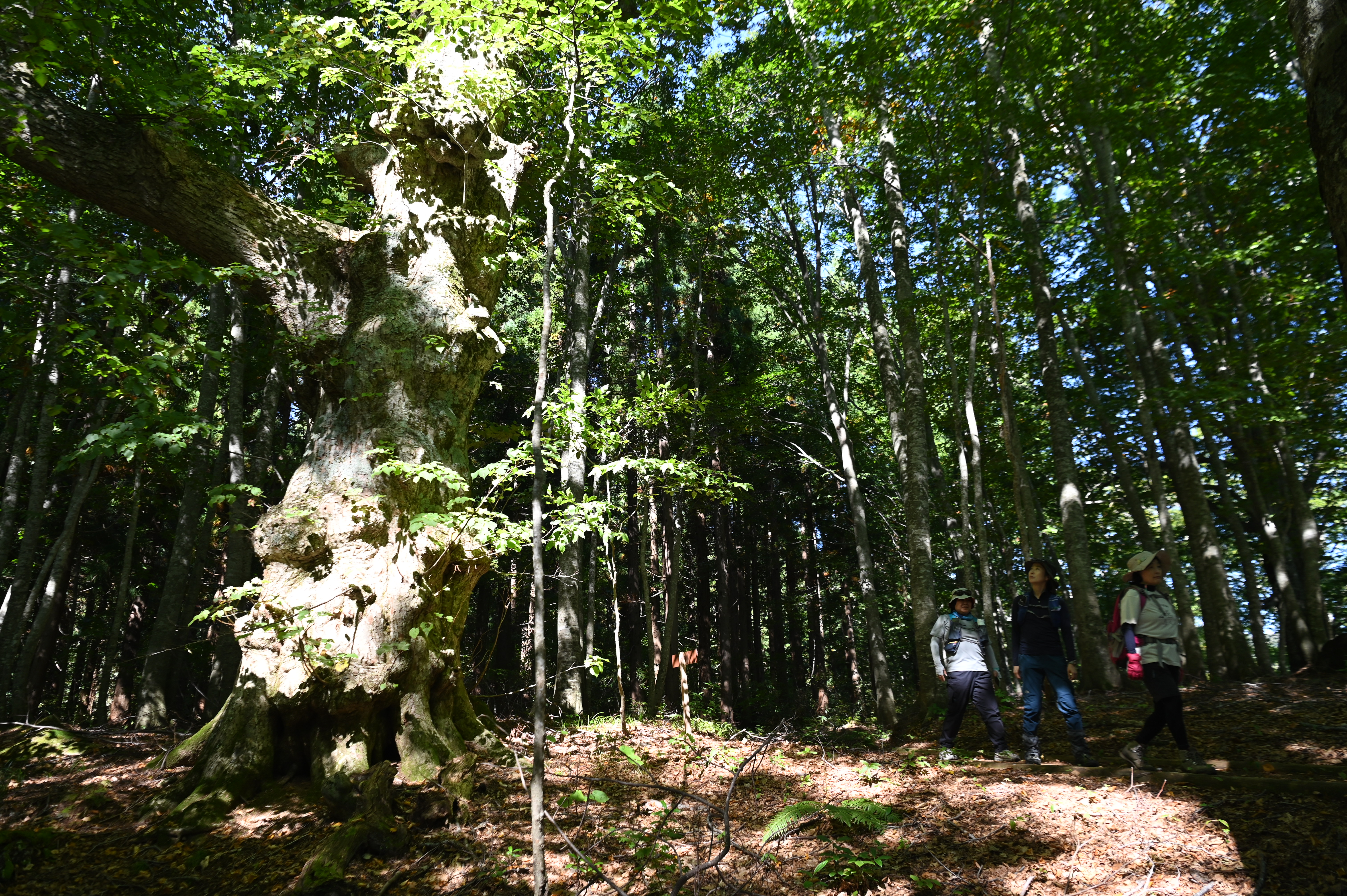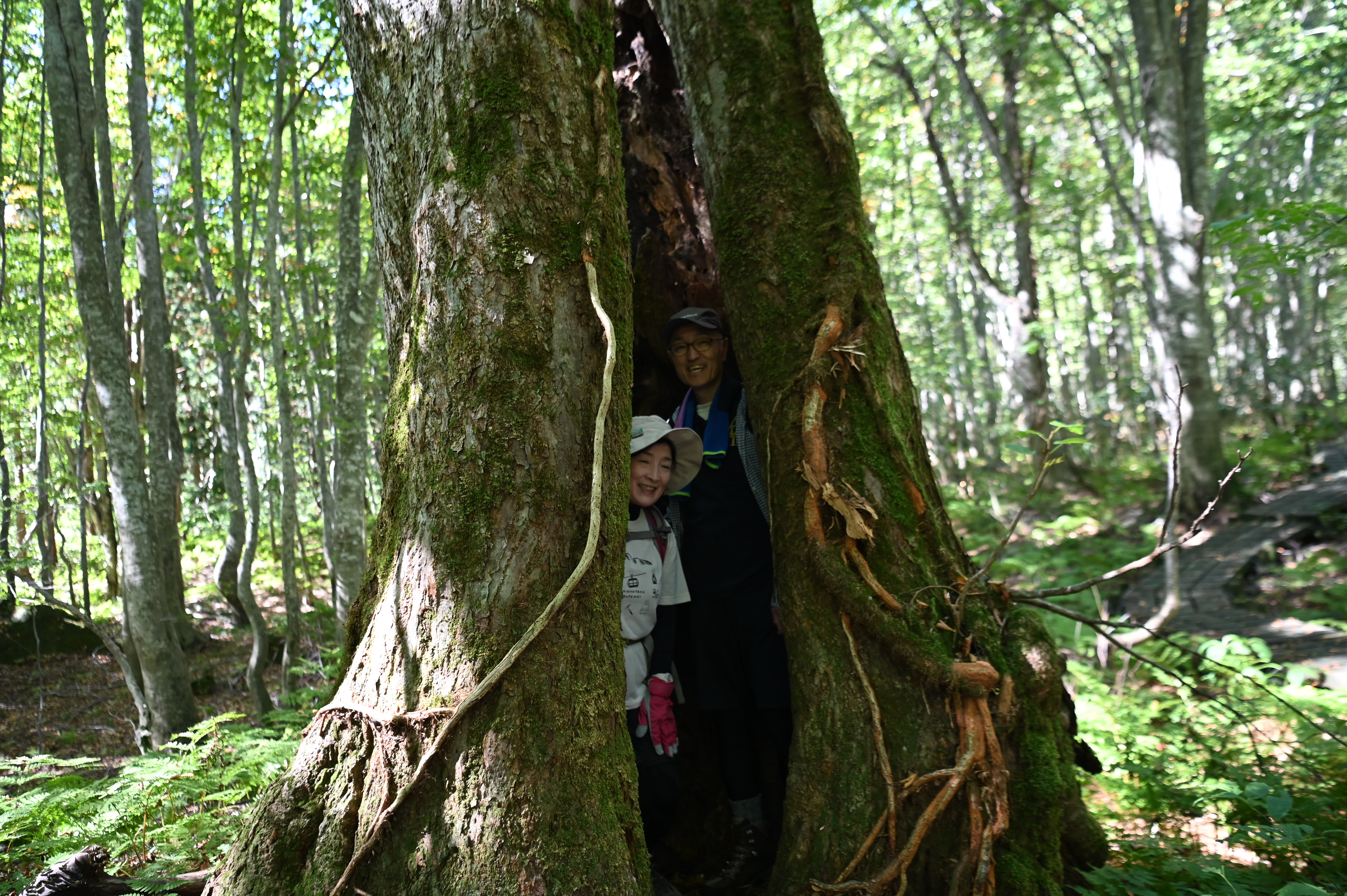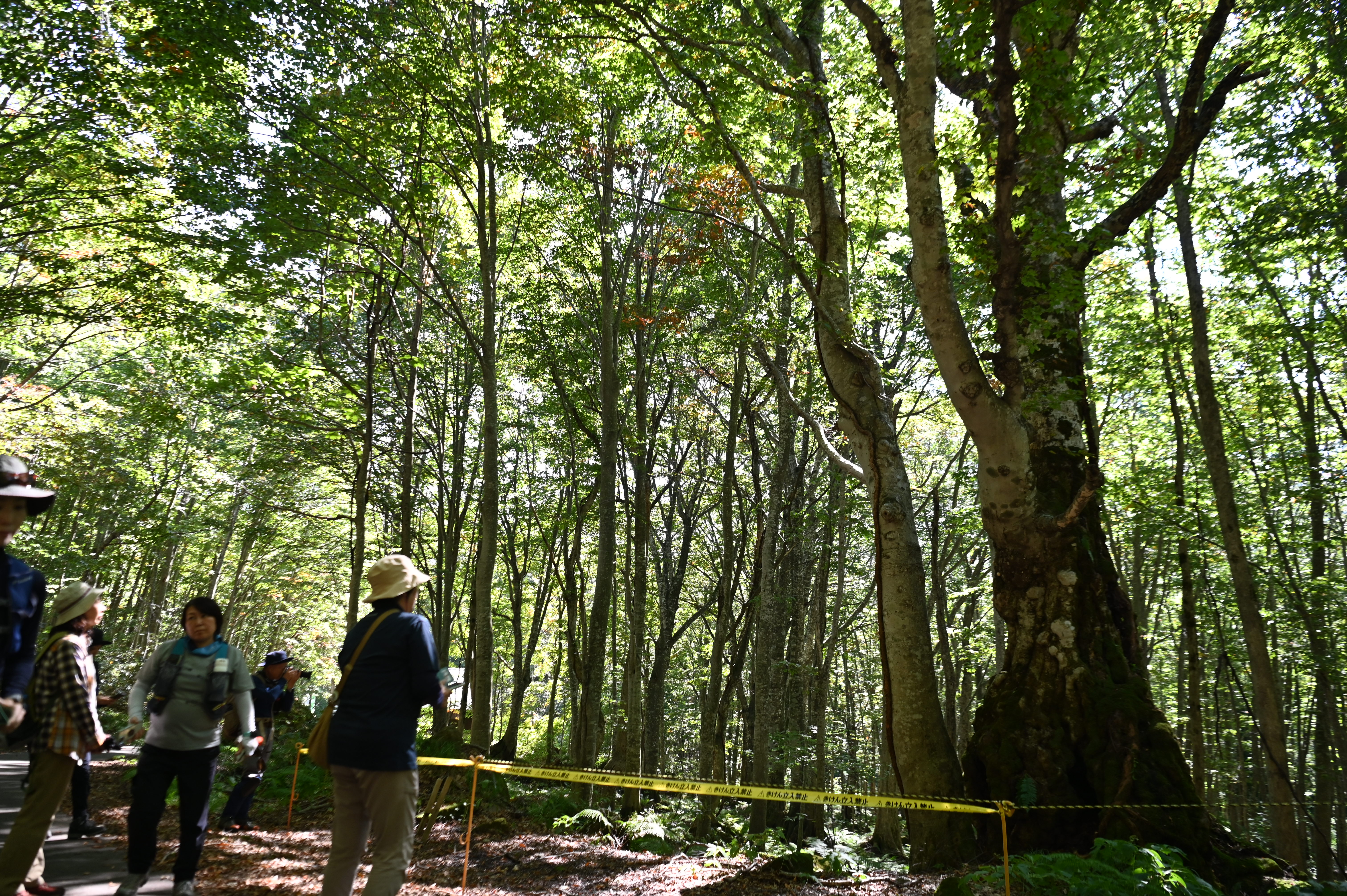 ブナの多い白神山地でもシナやイタヤカエデ、ホオノキ、サワグルミなど他の樹種も生えていること、稚樹の様子、400年ブナとギャップ、力尽きるように倒伏する木の根や、ベニタケ属のフェアリーリングなど見所たくさんでした。