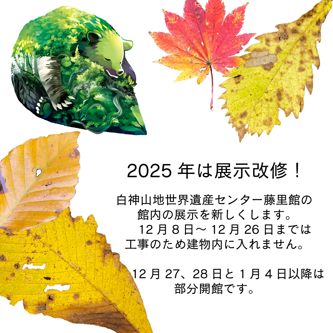 【冬季開館スケジュールへ切り替わり】12月から月火休館です 2025/11/30 明日12月1日から 白神山地世界遺産センター(藤里館)は 冬季開館日・開館時間に切り替わります。 また世界遺産センターの展示物を新しくする工事のため、 12月8日~12月26日まで世界遺産センターへの入館ができなくなります。 12月27、28日と、1月4日以降は部分開館です。